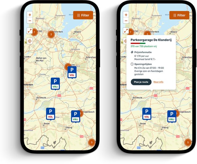 Door middel met een koppeling met RDW, is het mogelijk om parkeergarages op de kaart te tonen, inclusief het aantal beschikbare parkeerplaatsen.